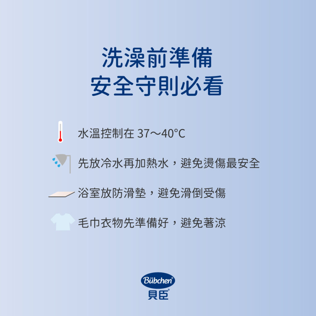 可在浴缸或地板放防滑墊,並準備柔軟毛巾與更換衣物,讓寶寶一出浴就能包裹溫暖。 - 毛巾衣物準備好