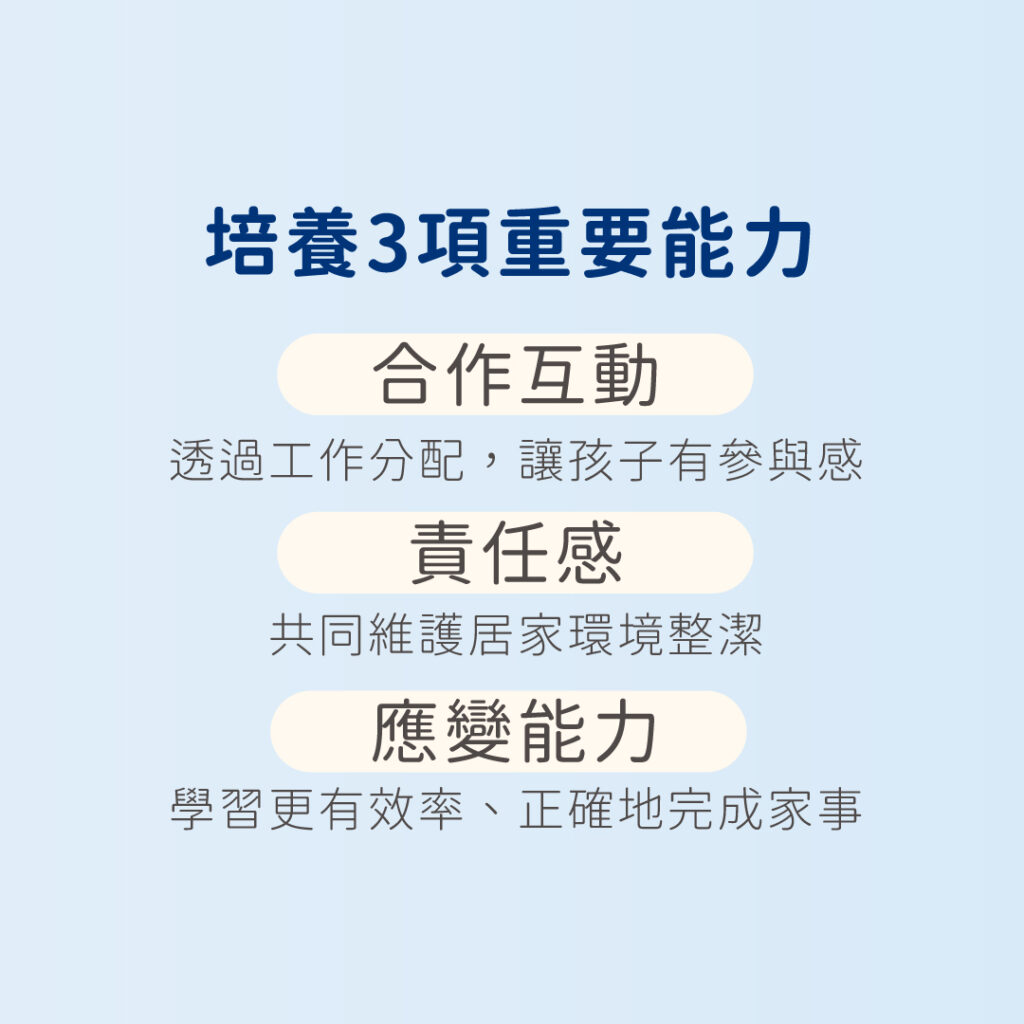 孩子的世界很單純,只需要一個願意讓他參與、被信任的環境。當我們放慢腳步,邀請孩子一起做家事,不只是完成清潔或整理,更是在教他如何照顧自己、尊重他人,也珍惜共同生活的家庭。